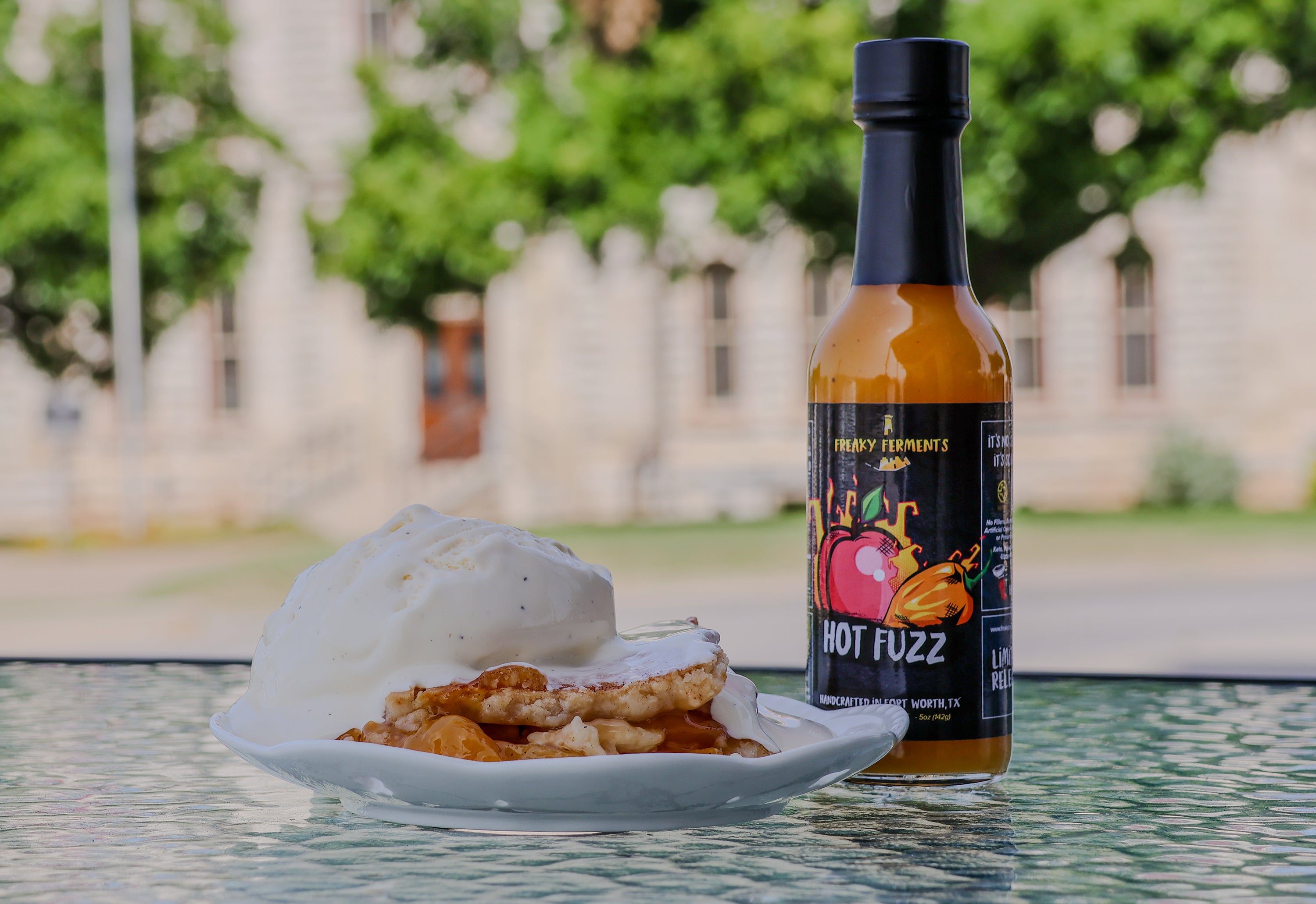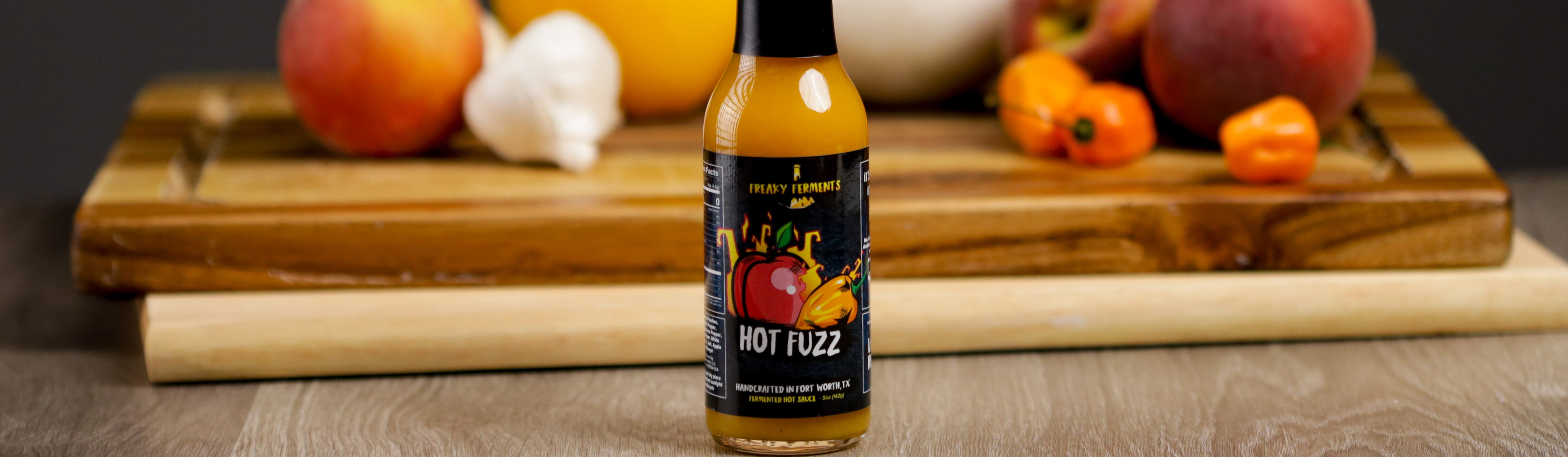 Hot Fuzz is a summer limited release! We waited for peach season here in Texas and paired them up with habaneros and Peruvian aji chilis. Best enjoyed with BBQ, pork dishes, pizza, wings, BLT sandwiches, margaritas, and pretty much anything!