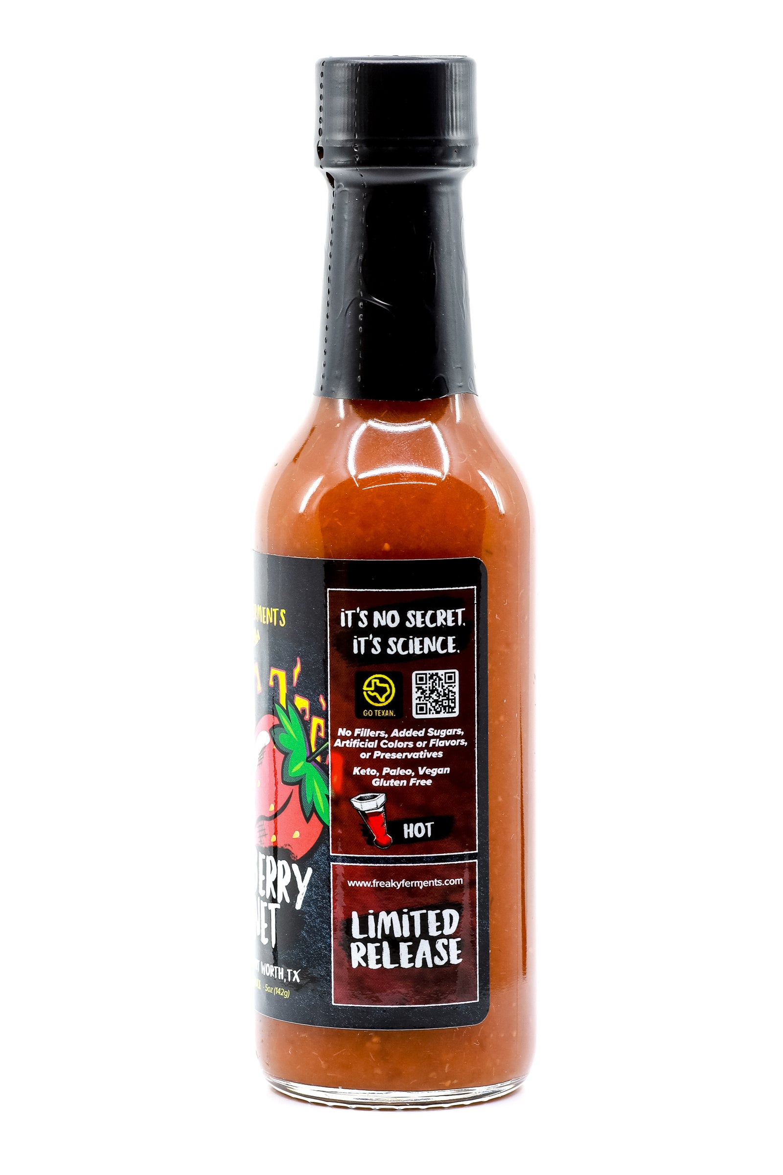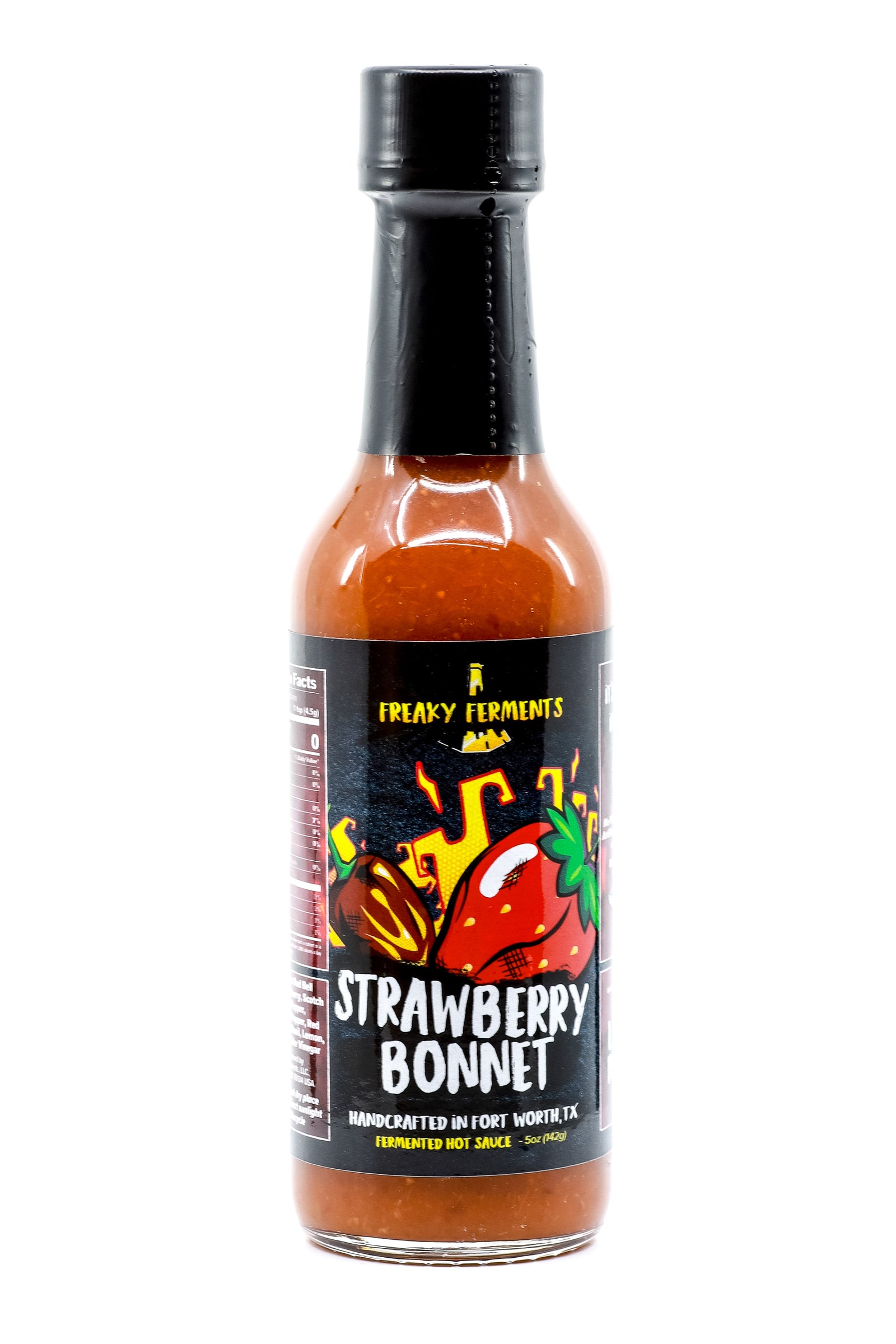 Made with freaky, fresh, simple, fermented ingredients: Red Bell Pepper, Strawberry, Scotch Bonnet Pepper, Aleppo Chile Pepper, Red Onion, Garlic, Basil, Lemon, Salt, Kombucha